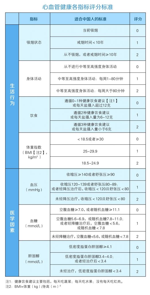 研究人員對(duì)美國(guó)心臟協(xié)會(huì)發(fā)布的評(píng)分標(biāo)準(zhǔn)進(jìn)行了修改,以更適應(yīng)中國(guó)人。7項(xiàng)指標(biāo)具體評(píng)分標(biāo)準(zhǔn)見下圖,得分越高表明該指標(biāo)越健康。
