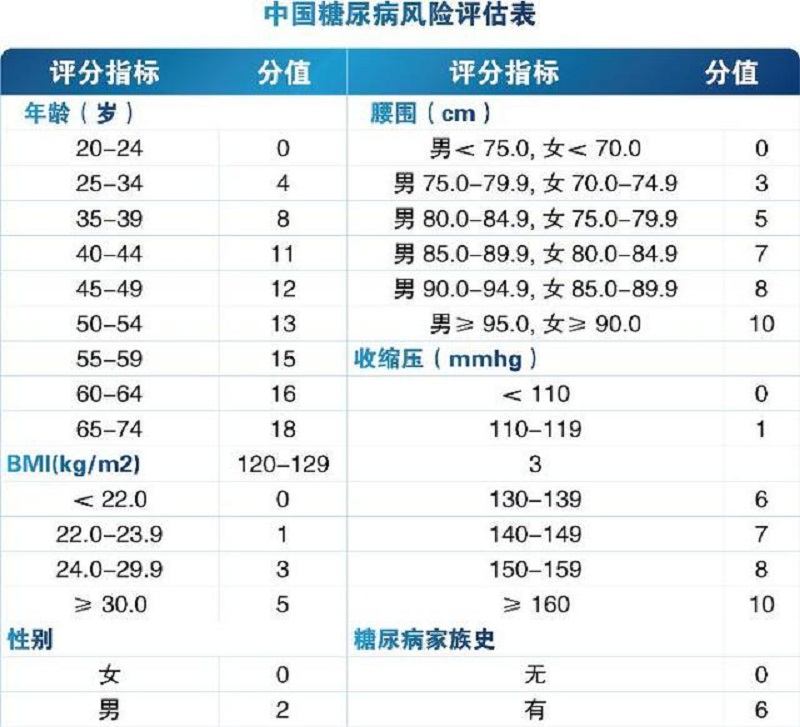 中國糖尿病風(fēng)險(xiǎn)評(píng)估表:根據(jù)下表計(jì)算分?jǐn)?shù),了解你是否有換上二型糖尿病的風(fēng)險(xiǎn),風(fēng)險(xiǎn)評(píng)估數(shù)值<25,低風(fēng)險(xiǎn);≥25,高風(fēng)險(xiǎn);