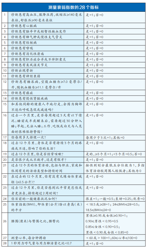 基于對約51.3萬名30~79歲參與者進行的平均長達10.8年的隨訪調(diào)查研究,北京大學公共衛(wèi)生學院研究人員總結(jié)出了一套更為詳細的衰弱判定指標。研究納入28個指標來計算個人的衰弱指數(shù),具體包括14種疾病、10種癥狀或體征、4種身體測量指標三大類(見上表)。研究作者之一、北京大學公共衛(wèi)生學院流行病與衛(wèi)生統(tǒng)計學系副主任呂筠介紹,上述指標主要是根據(jù)研究人群患病率、能否反映健康狀態(tài),以及不能過早飽和等原則篩選得出的。比如,疾病患病率一般在0.5%以上,但又不像老花眼那樣在50歲以上人群中過于普遍,同時也不像白發(fā)一樣僅能作為一種生理表征。