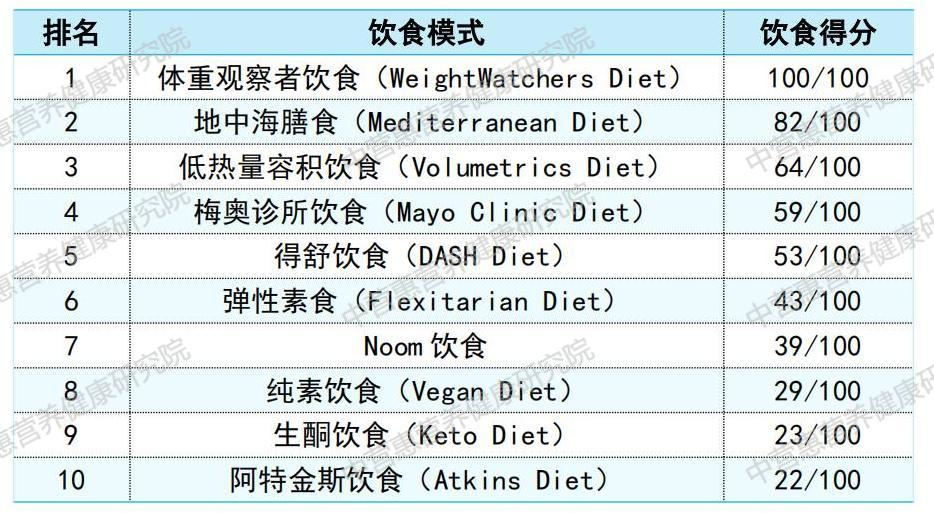 2024年初,《美國(guó)新聞與世界報(bào)道》發(fā)布了最佳減肥飲食排名,體重觀察者飲食、地中海飲食、低熱量容積飲食位列前三。以下列出了排名前十位的最佳減肥飲食以及飲食得分(表2),供大家參考。