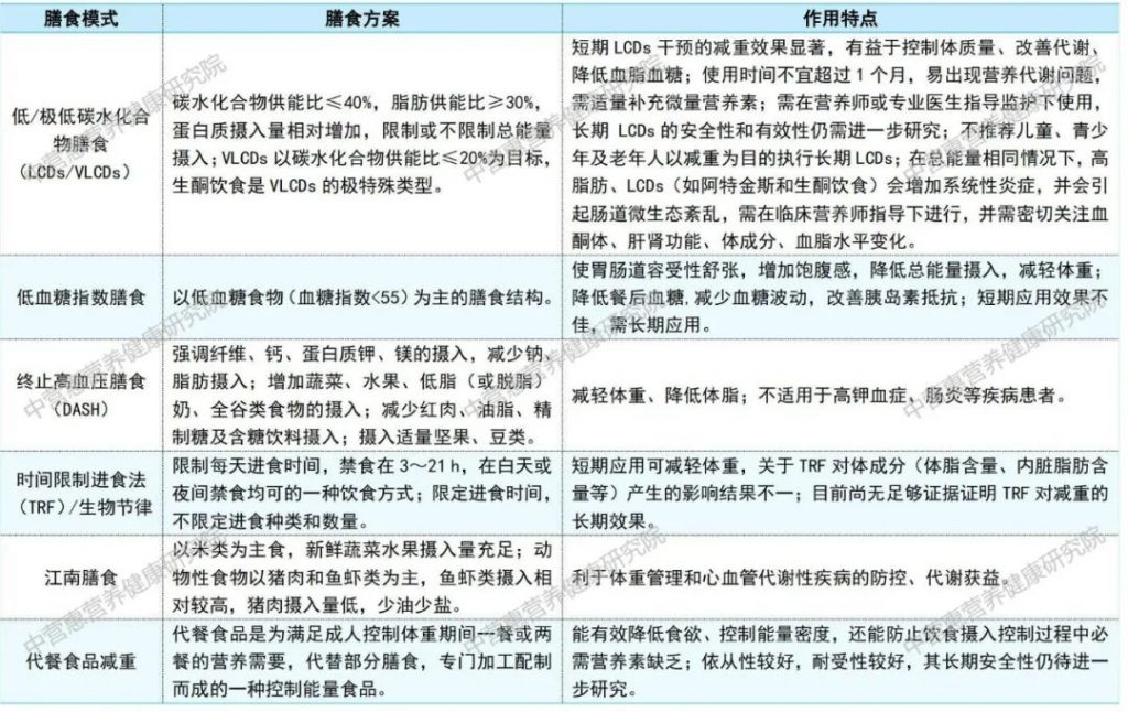 能量平衡是影響體重的關(guān)鍵因素,攝入的能量少于消耗的能量才能實(shí)現(xiàn)體重控制的目標(biāo),飲食干預(yù)在其中起著關(guān)鍵作用。飲食干預(yù)通過(guò)合理調(diào)整飲食結(jié)構(gòu)和控制能量攝入,幫助人們實(shí)現(xiàn)健康的體重管理;且飲食干預(yù)相對(duì)容易實(shí)施,不需要高昂的費(fèi)用和復(fù)雜的設(shè)備,人們可以在日常生活中輕松進(jìn)行。因此,無(wú)論是從健康角度還是經(jīng)濟(jì)角度考慮,飲食干預(yù)都是一種理想的體重管理方式。以下我們將重點(diǎn)介紹幾種常見(jiàn)的減重膳食模式,并列出其他一些常見(jiàn)的減重膳食模式及特點(diǎn)供大家參考(表1)。