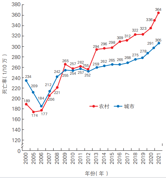 圖2 2000~2021年中國(guó)城鄉(xiāng)居民心血管病死亡率變化趨勢(shì)